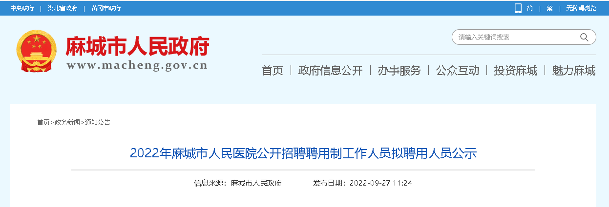 2022湖北黃岡市麻城市人民醫(yī)院招聘聘用制工作人員擬聘用人員公示已出,公示時(shí)間:2022年9月26日至30日,現(xiàn)將招聘公示原文發(fā)布如下: