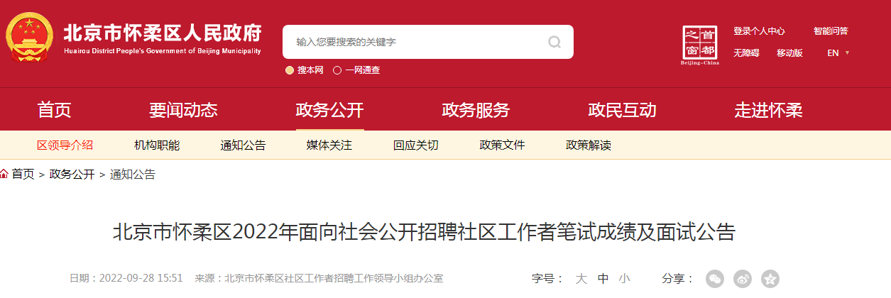 原文標(biāo)題:北京市懷柔區(qū)2022年面向社會(huì)公開(kāi)招聘社區(qū)工作者筆試成績(jī)及面試公告