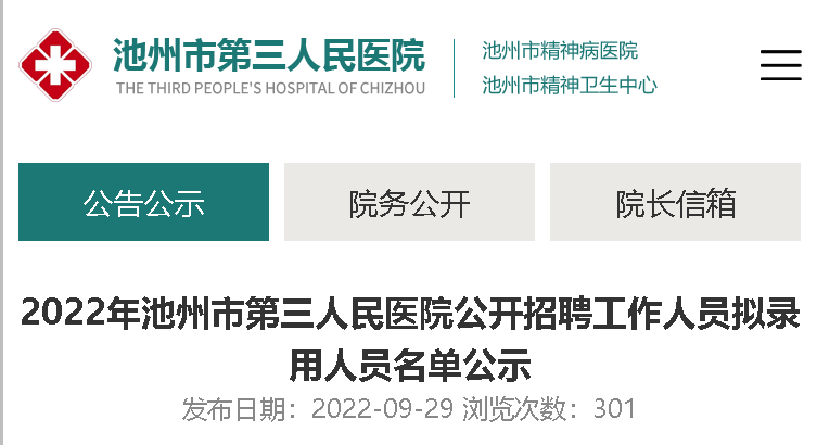 2022安徽池州市第三人民醫(yī)院招聘擬錄用人員名單公示已出,公示時間從2022年9月29日至10月5日,現(xiàn)將招聘公示原文發(fā)布如下:
