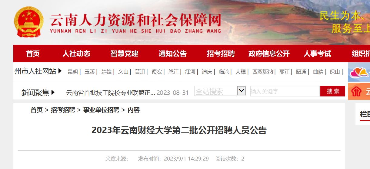 按照《事業(yè)單位公開(kāi)招聘人員暫行規(guī)定》(人事部令第6號(hào))《云南省事業(yè)單位公開(kāi)招聘工作人員辦法》(云人社發(fā)〔2016〕182號(hào))等法律法規(guī),根據(jù)工作需要,經(jīng)省教育廳和省人力資源社會(huì)保障廳批準(zhǔn),2023年云南財(cái)經(jīng)大學(xué)計(jì)劃第二批面向社會(huì)公開(kāi)招聘人員35名,現(xiàn)將有關(guān)事項(xiàng)公告如下: