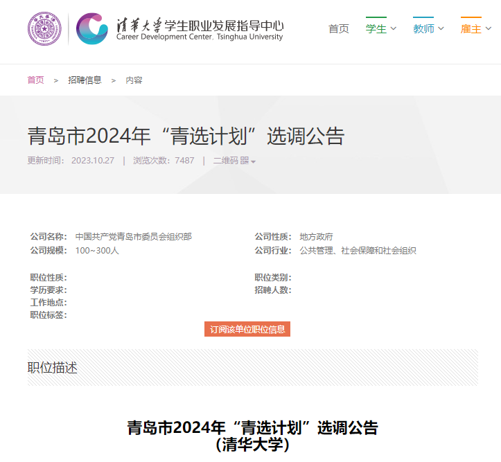 從清華大學(xué)學(xué)生職業(yè)發(fā)展指導(dǎo)中心獲悉,2024年山東青島市“青選計劃”定向選調(diào)全日制優(yōu)秀應(yīng)屆畢業(yè)生500人,報名時間:2023年10月30日-11月9日,初選及綜合測試時間:另行通知,更多事宜請參考閱讀《考試公告》,官方公告原文如下: