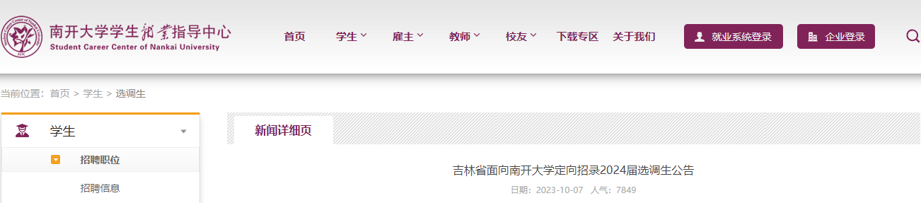 從南開(kāi)大學(xué)學(xué)生就業(yè)指導(dǎo)中心獲悉,吉林省面向南開(kāi)大學(xué)定向招錄2024屆選調(diào)生。報(bào)名時(shí)間:2023年10月20日-31日,考試時(shí)間:2023年11月11日,更多事宜請(qǐng)參考閱讀《考試公告》,官方公告原文如下: