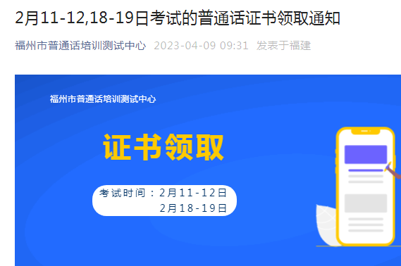 從福州市普通話培訓測試中心獲悉,2023年2月11、12、18、19日考試的福建福州普通話證書領取通知已公布,每周四上班時間領取,具體詳情如下: