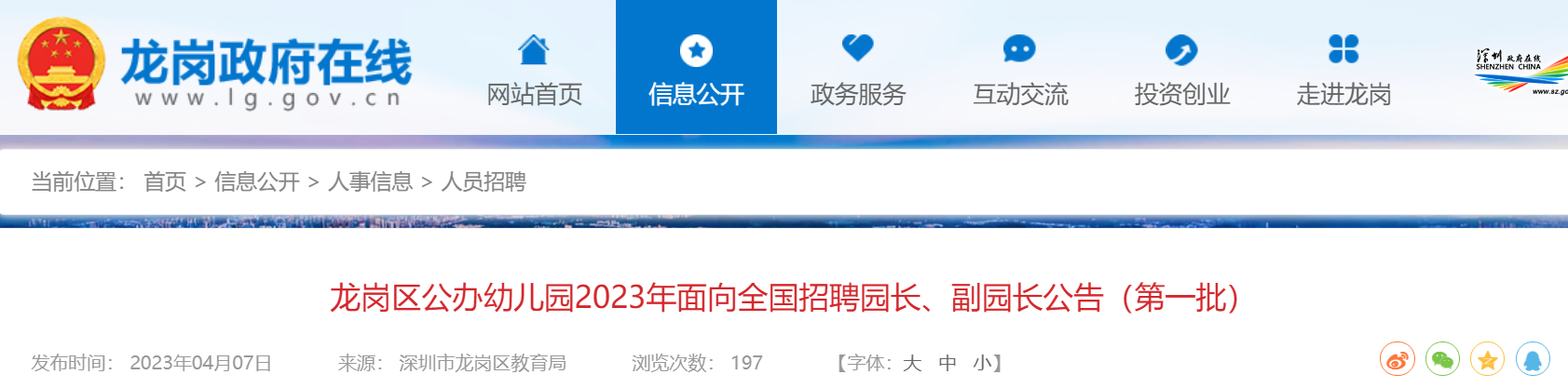 2023年廣東深圳龍崗區(qū)公辦幼兒園第一批面向全國(guó)招聘園長(zhǎng)、副園長(zhǎng)公告已發(fā)布,報(bào)名時(shí)間:公告發(fā)布之日起至2023年4月24日18:00前?,F(xiàn)將招聘公告原文發(fā)布如下: