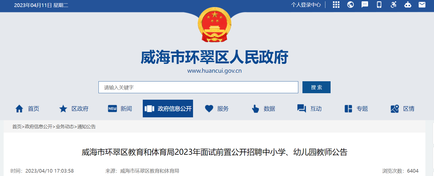 2023年山東威海市環(huán)翠區(qū)教育和體育局面試前置公開招聘中小學、幼兒園教師89人,報名時間:2023年4月16日9:00—4月18日16:00。現(xiàn)將招聘公告原文發(fā)布如下: