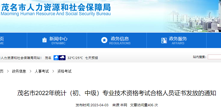 小編根據(jù)茂名市人力資源和社會保障局發(fā)布“茂名市2022年統(tǒng)計(初、中級)專業(yè)技術(shù)資格考試合格人員證書發(fā)放的通知”得知,2022年廣東茂名中級統(tǒng)計師考試合格人員證書發(fā)放時間為4月4日起,詳情如下: