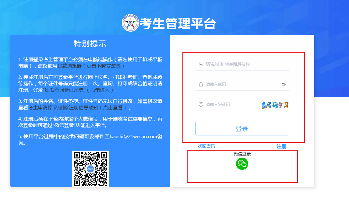 溫馨提示:登錄考生管理平臺(tái)必須在電腦端操作(請(qǐng)勿使用手機(jī)或平板電腦),建議使用谷歌瀏覽器。