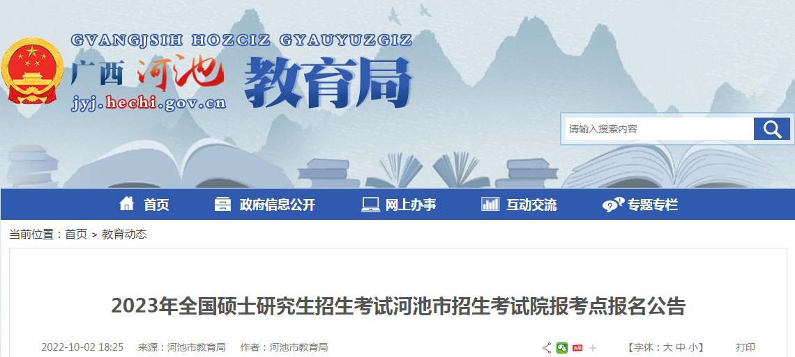 根據(jù)《教育部關(guān)于印發(fā)<2023年全國(guó)碩士研究生招生工作管理規(guī)定>的通知》(教學(xué)〔2022〕3號(hào))及《廣西2023年全國(guó)碩士研究生招生考試報(bào)名公告》精神,為做好2023年全國(guó)碩士研究生招生統(tǒng)一考試河池市招生考試院報(bào)考點(diǎn)的報(bào)名工作,現(xiàn)將有關(guān)事項(xiàng)公告如下:
