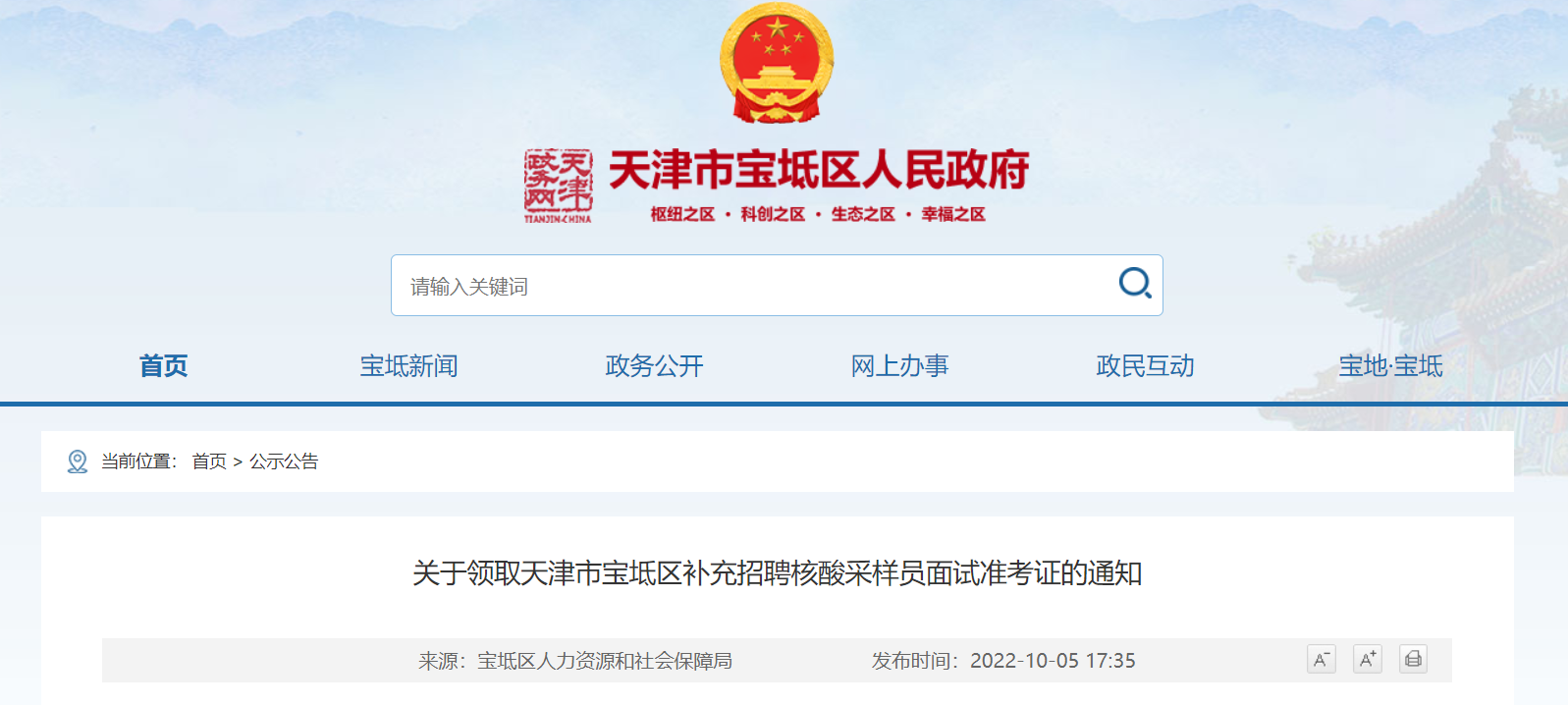原文標題:關于領取天津市寶坻區(qū)補充招聘核酸采樣員面試準考證的通知