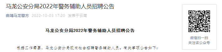 根據(jù)工作需要,馬龍公安分局現(xiàn)向社會招聘警務(wù)輔助人員。有關(guān)事項公告如下: