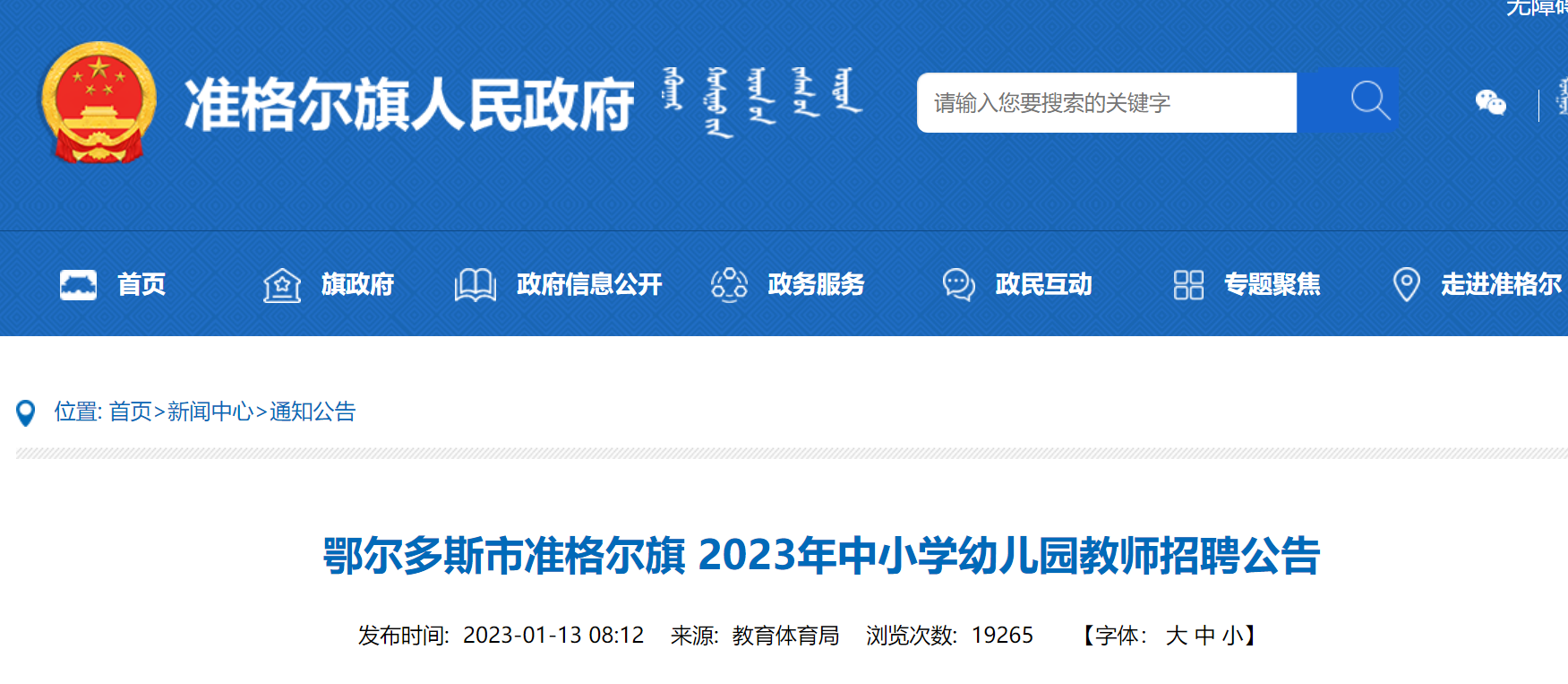2023年內(nèi)蒙古鄂爾多斯市準(zhǔn)格爾旗中小學(xué)幼兒園招聘教師80人,報(bào)名時(shí)間:2023年1月14日上午8:30至2023年1月20日下午17:30?,F(xiàn)將招聘公告原文發(fā)布如下: