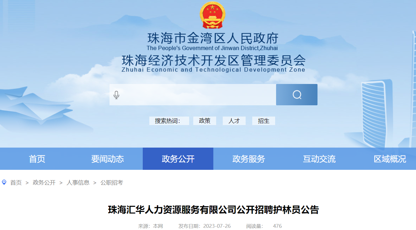 因工作需要,珠海匯華人力資源服務(wù)有限公司面向社會(huì)公開(kāi)招聘護(hù)林員1名(錄用后派遣至南水鎮(zhèn)社會(huì)事務(wù)服務(wù)中心工作),現(xiàn)公告如下: