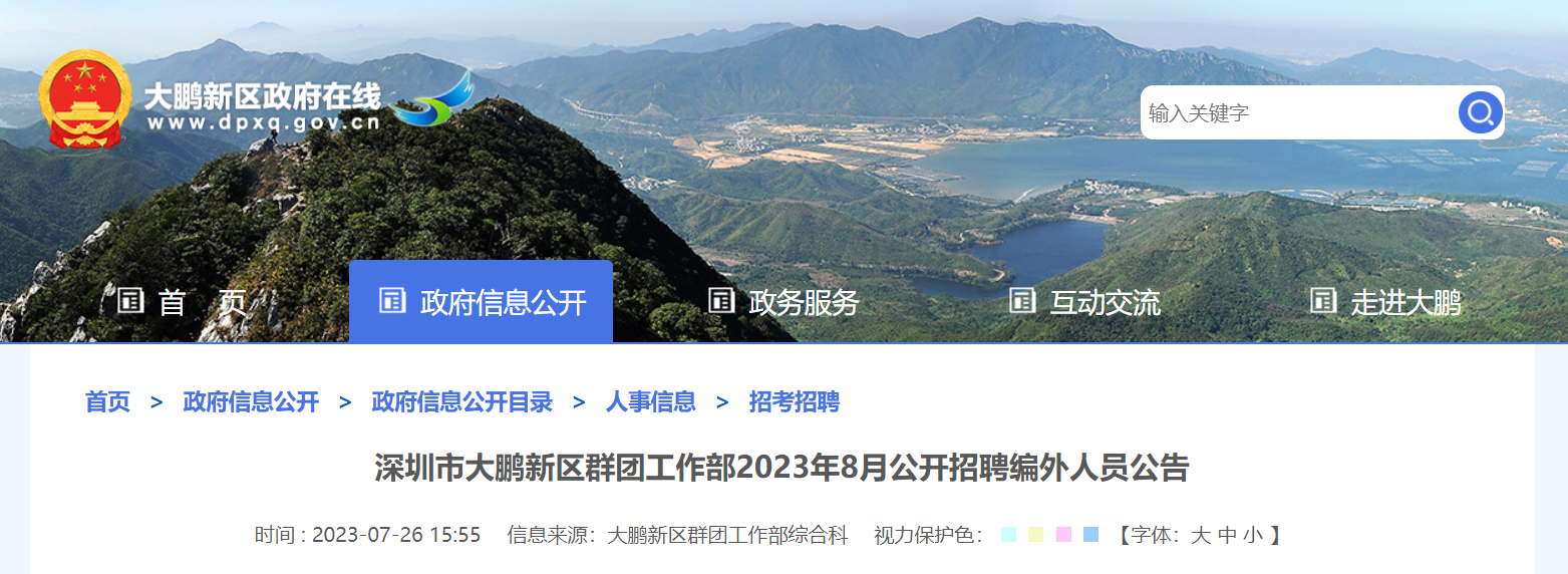 2023年8月廣東省深圳市大鵬新區(qū)群團(tuán)工作部招聘編外人員1人。報名時間:2023年7月31日10:00至2023年8月4日17:30。現(xiàn)將公告原文發(fā)布如下: