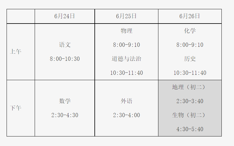 6月24日至26日上午,初三年級(jí)學(xué)考;6月26日下午,初二年級(jí)學(xué)考