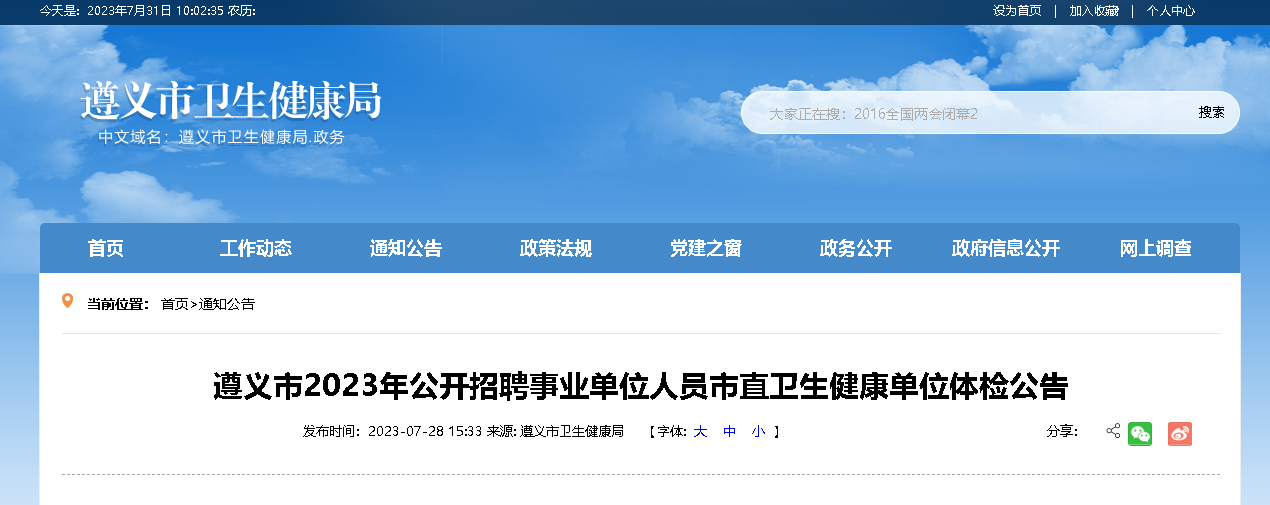 2023貴州遵義市事業(yè)單位衛(wèi)生健康單位招聘體檢時間已公布,體檢集中時間:2023年8月2日上午7:20,現(xiàn)將招聘公告原文發(fā)布如下:
