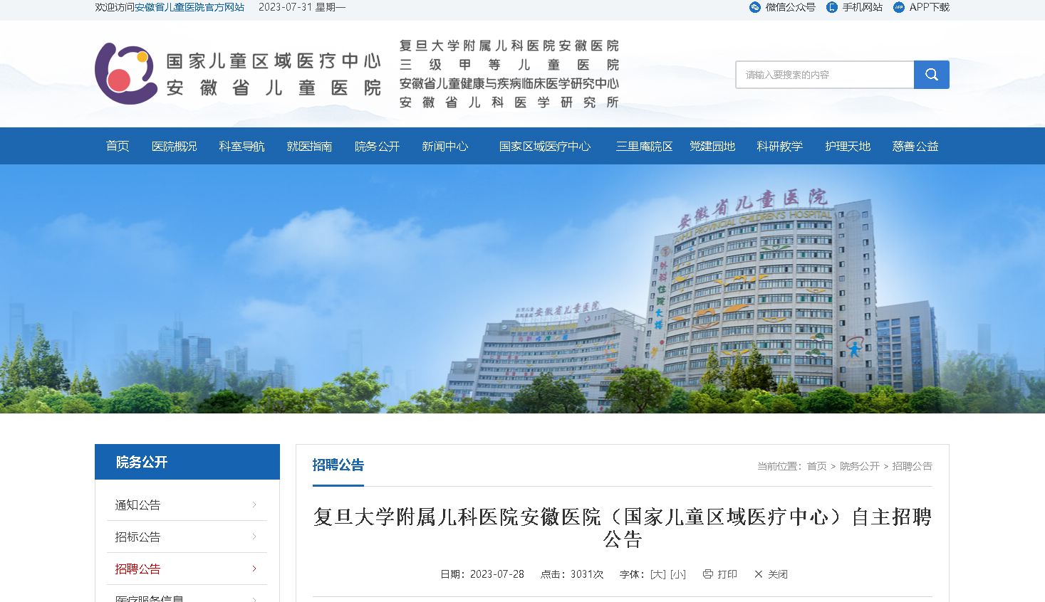 2023復(fù)旦大學(xué)附屬兒科醫(yī)院安徽醫(yī)院(國家兒童區(qū)域醫(yī)療中心)自主招聘工作人員,報(bào)名時(shí)間:自本公告公布之日起至2023年8月6日24:00,現(xiàn)將招聘公告原文發(fā)布如下: