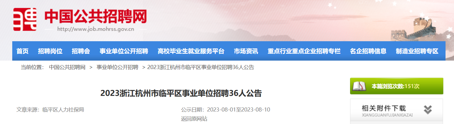 2023年浙江省杭州市臨平區(qū)事業(yè)單位招聘36人。報名時間:2023年8月1日9時—8月10日17時?,F(xiàn)將公告原文發(fā)布如下: