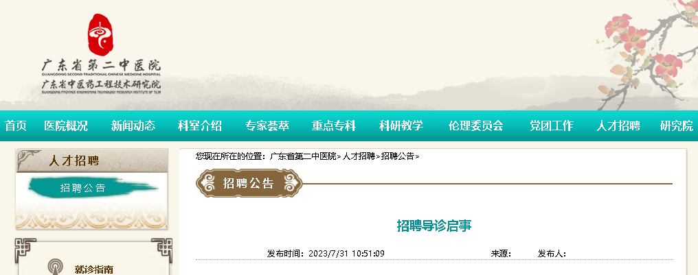 2023廣東省第二中醫(yī)院招聘導診1人,簡歷投遞時間:2022-7-31至2023-8-9周一至周五全天、周六上午,現(xiàn)將招聘公告原文發(fā)布如下: