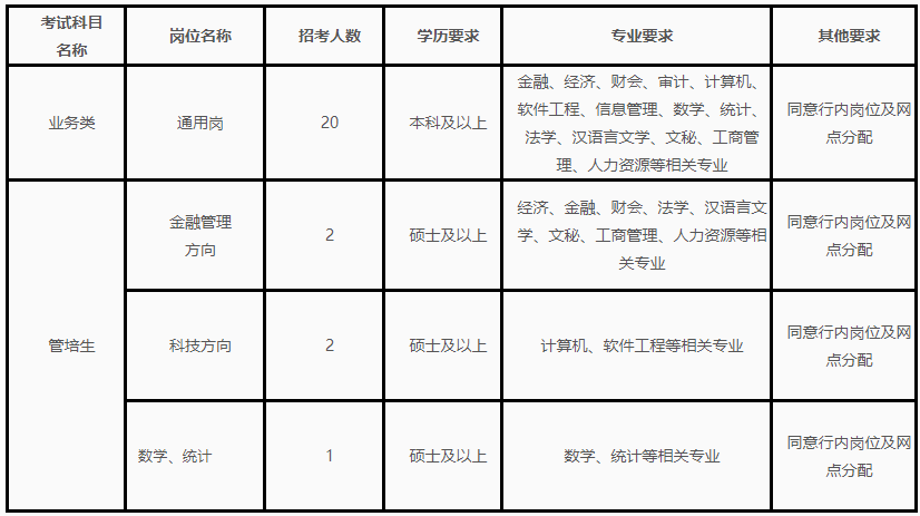 1.業(yè)務類:境內普通高等院校和境外高等院校大學本科及以上學歷畢業(yè)生,并取得相應學位,專業(yè)符合對應崗位相關要求。