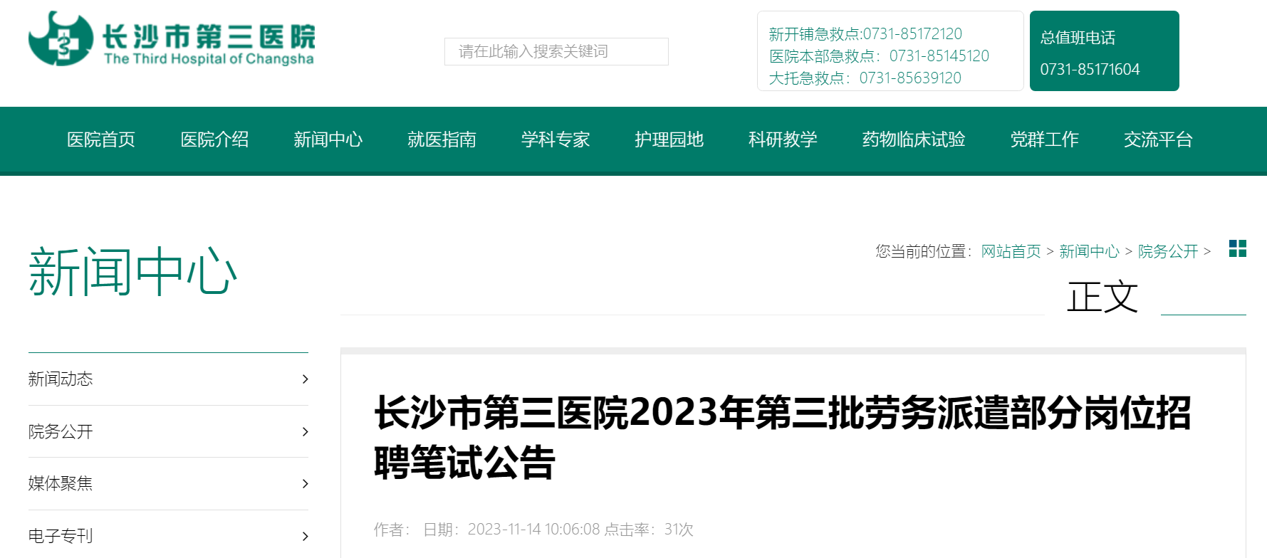 2023湖南長沙市第三醫(yī)院第三批勞務(wù)派遣部分崗位招聘筆試公告已發(fā)布,筆試時間:2023年11月17日(周五)8:30-10:00,現(xiàn)將公告原文發(fā)布如下:
