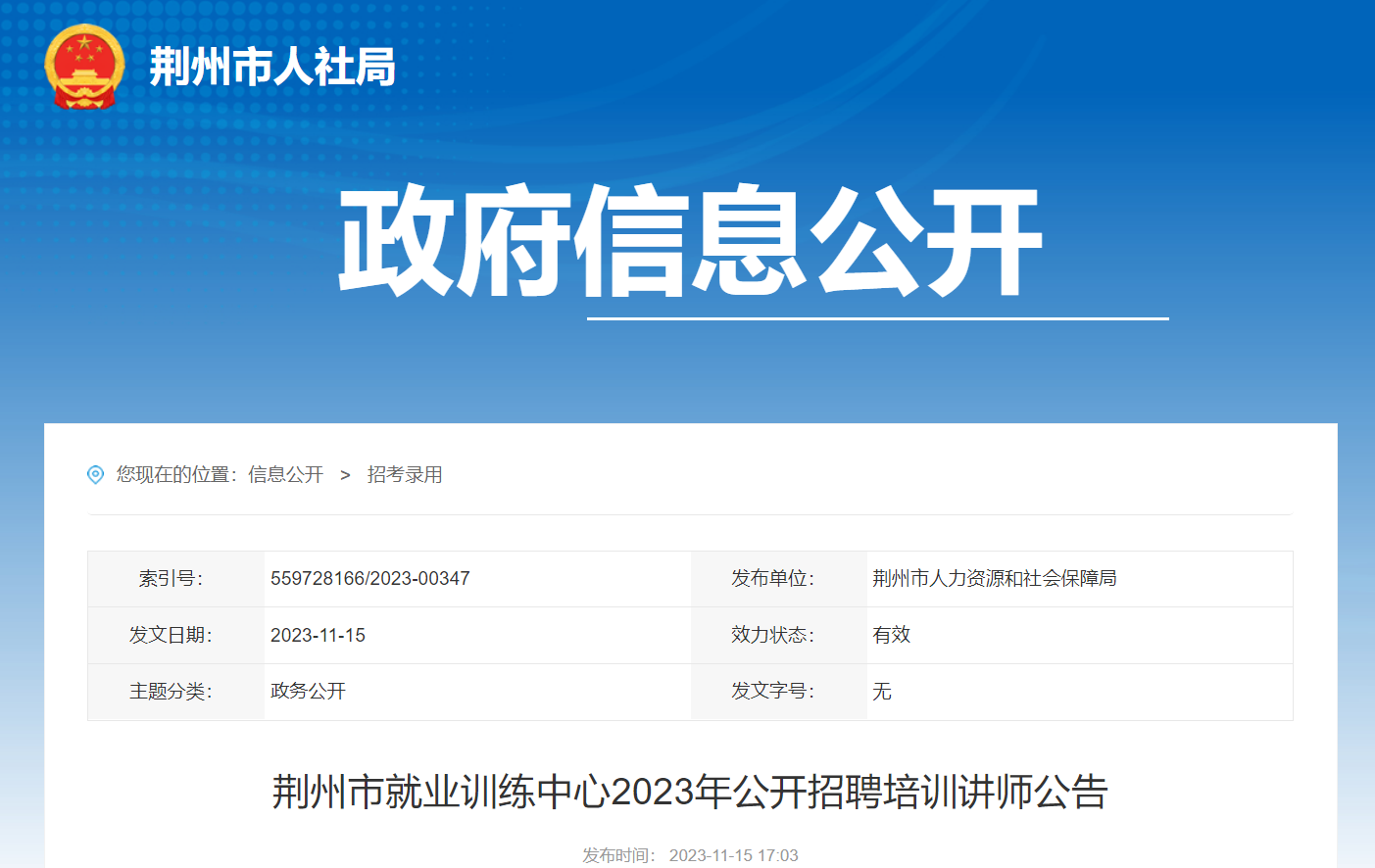 2023年湖北荊州市就業(yè)訓練中心公開招聘培訓講師公告已發(fā)布,報名時間:2023年11月16日9:00至11月21日17:00?,F(xiàn)將招聘公告原文發(fā)布如下: