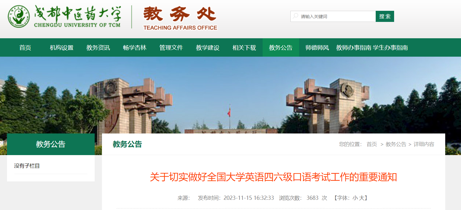 全國大學(xué)英語四六級口語考試將于2023年11月18-19日上午在成都中醫(yī)藥大學(xué)溫江校區(qū)明德樓(A教)進(jìn)行。為切實(shí)做好考試期間相關(guān)工作,現(xiàn)就本次考試安排及注意事項(xiàng)通知如下: