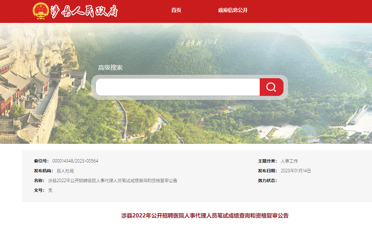 2022河北邯鄲市涉縣招聘醫(yī)院人事代理人員筆試成績查詢和資格復審公告已出,資格復審時間:2023年1月30日至1月31日,現(xiàn)將招聘公告原文發(fā)布如下:
