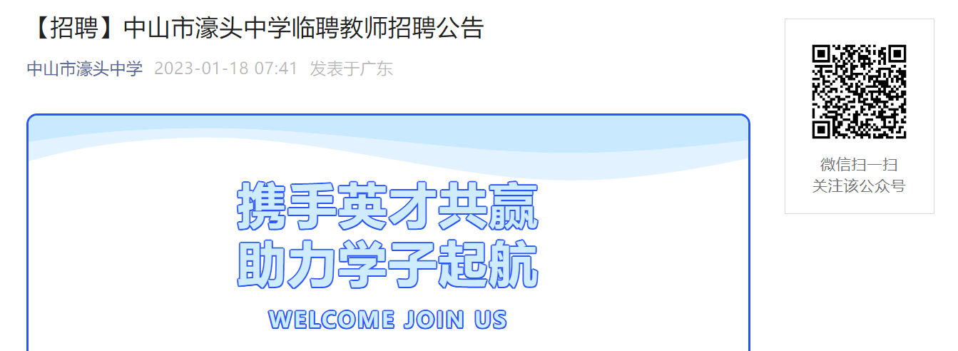 2023廣東中山市濠頭中學(xué)日語、數(shù)學(xué)臨聘教師招聘公告已發(fā)布,聯(lián)系地址:廣東省中山市火炬街道聯(lián)富社區(qū)濠東路18號(廣珠城軌中山站對面)?,F(xiàn)將招聘公告原文發(fā)布如下: