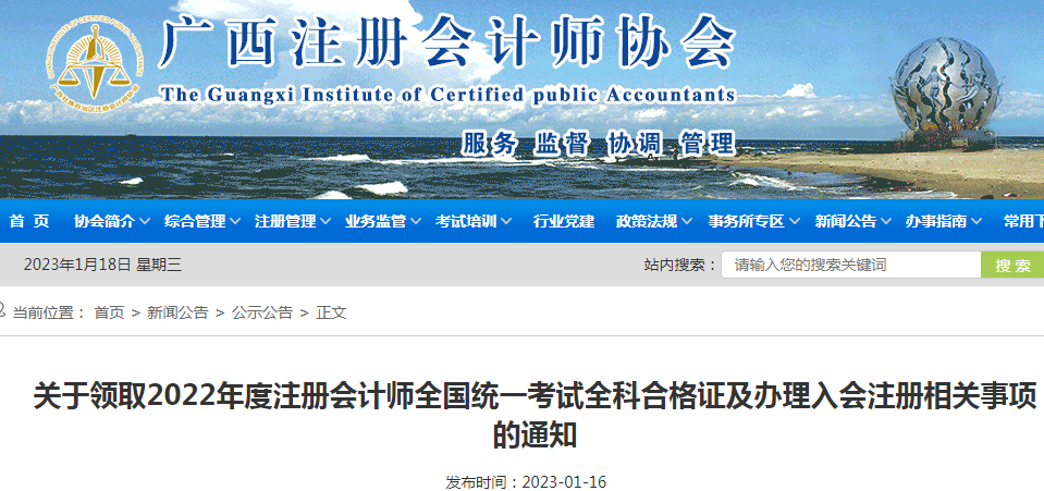 小編根據(jù)廣西注冊(cè)會(huì)計(jì)師協(xié)會(huì)發(fā)布“關(guān)于領(lǐng)取2022年度注冊(cè)會(huì)計(jì)師全國(guó)統(tǒng)一考試全科合格證及辦理入會(huì)注冊(cè)相關(guān)事項(xiàng)的通知”得知,2022年廣西注冊(cè)會(huì)計(jì)師全科合格證領(lǐng)取時(shí)間為2023年1月16日至3月31日,詳情如下: