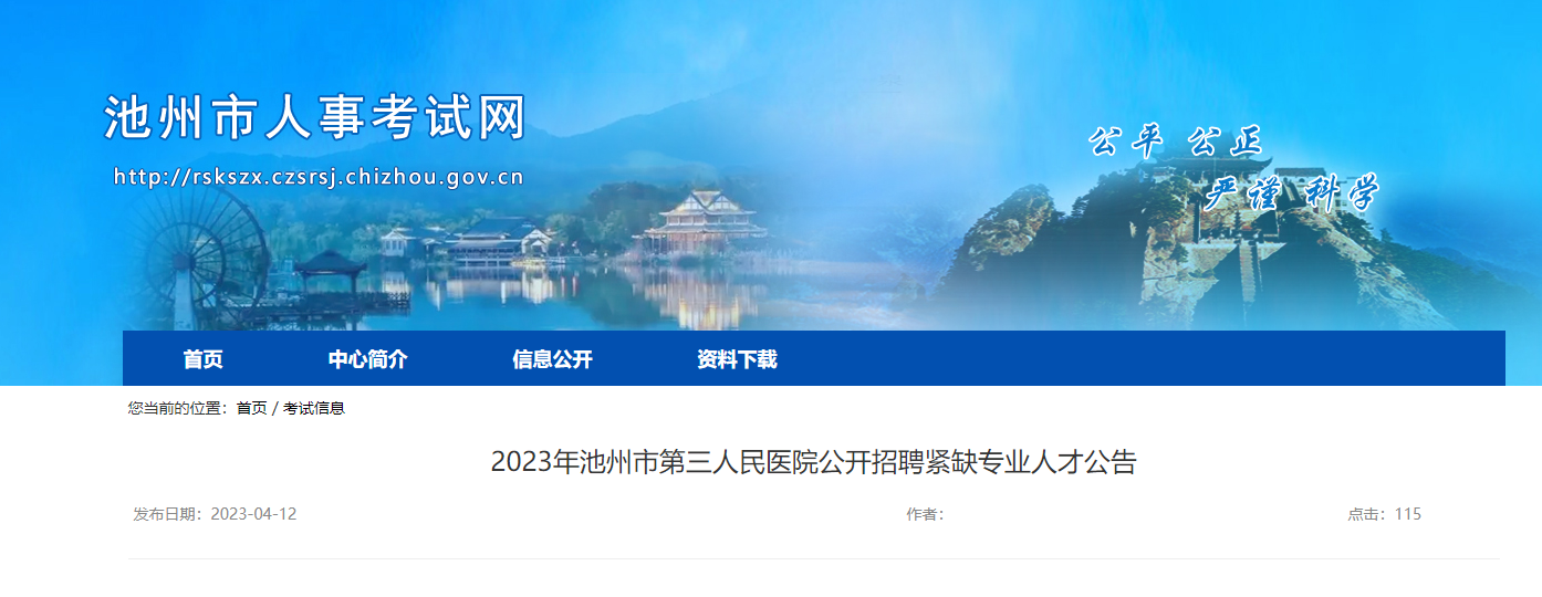 本次招聘工作啟動后的成績公示、體檢通知等有關(guān)信息將在池州市人事考試培訓(xùn)網(wǎng)站、池州市第三人民醫(yī)院網(wǎng)站發(fā)布,報考人員請及時在該網(wǎng)站了解相關(guān)信息。