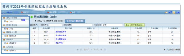 考生點擊“查詢院校計劃”列表下的科類名稱,進入院校計劃查詢頁面??忌梢暂斎朐盒4?、或者院校名稱和專業(yè)名稱查找要報考的院校和專業(yè)。系統(tǒng)支持模糊查詢,例如在專業(yè)名稱中輸入“法學”,可顯示所有專業(yè)名稱中含“法學”的院校信息。(圖-5)