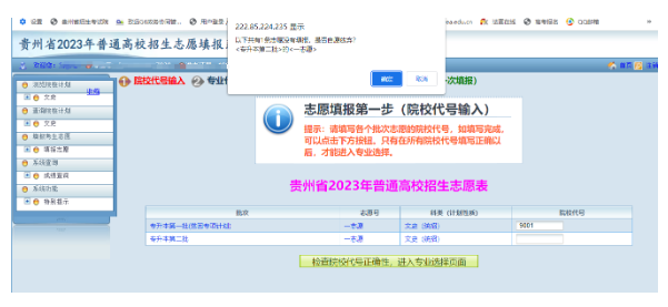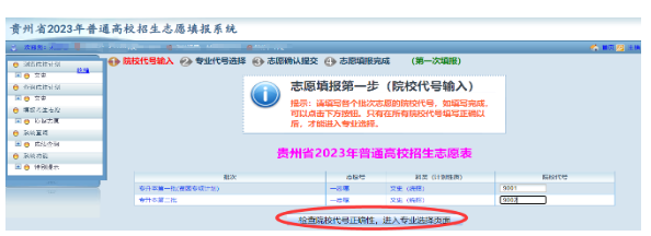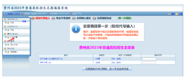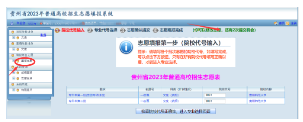 2.考生按照本人事先預填的志愿,輸入院校代號,點擊“檢查院校代號正確性”按鈕,進入下個頁面。(圖-8)