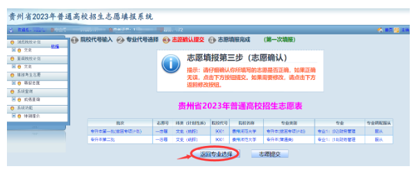 在檢查過程中如果發(fā)現(xiàn)錯誤,請點擊頁面下方的“返回專業(yè)選擇”按鈕進行修改。(圖-15)