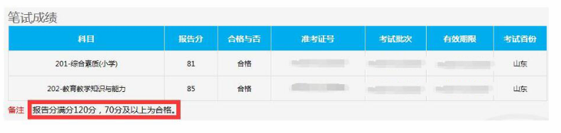 根據(jù)下圖教師資格證筆試成績示例,教師資格證報告分滿分120分,70分及以上為合格。