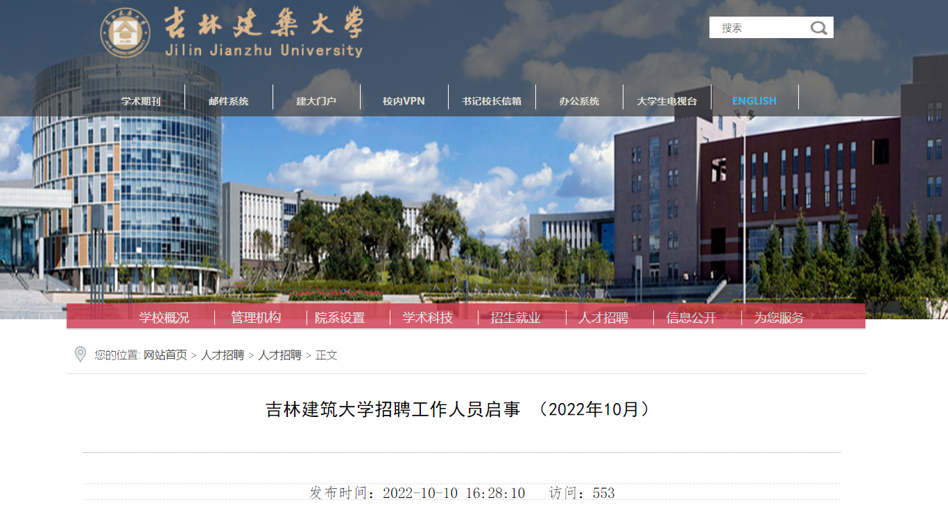 2022年10月吉林建筑大學(xué)招聘工作人員啟事已發(fā)布,報(bào)名時(shí)間:2022年10月10日至10月14日,現(xiàn)將招聘公告原文發(fā)布如下: