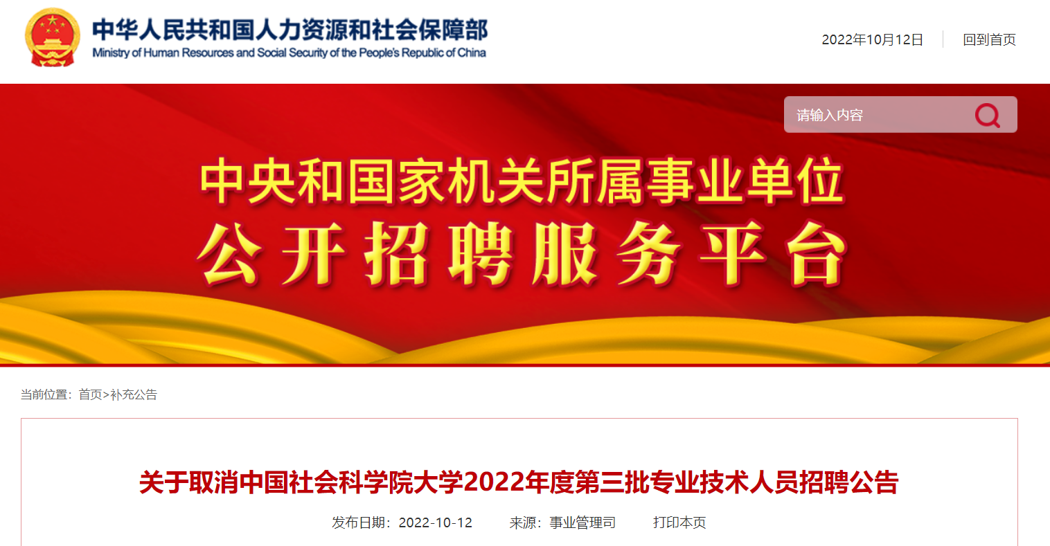 原文標題:關(guān)于取消中國社會科學(xué)院大學(xué)2022年度第三批專業(yè)技術(shù)人員招聘公告