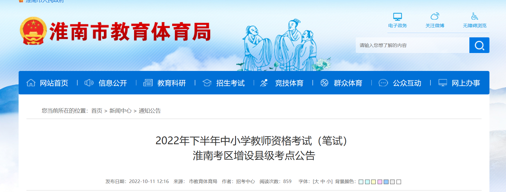 原文標(biāo)題:2022年下半年中小學(xué)教師資格考試(筆試)淮南考區(qū)增設(shè)縣級(jí)考點(diǎn)公告