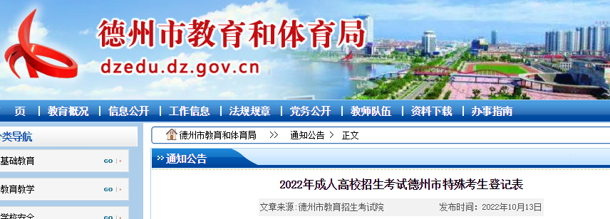 成人高考頻道從德州市教育和體育局了解到,2022年成人高校招生考試山東德州特殊考生登記表已公布,請相關(guān)成人高考考生登錄德州市教育和體育局(http://dzedu.dezhou.gov.cn/index.html)“通知公告”欄目,或者點擊下方鏈接進行查看。