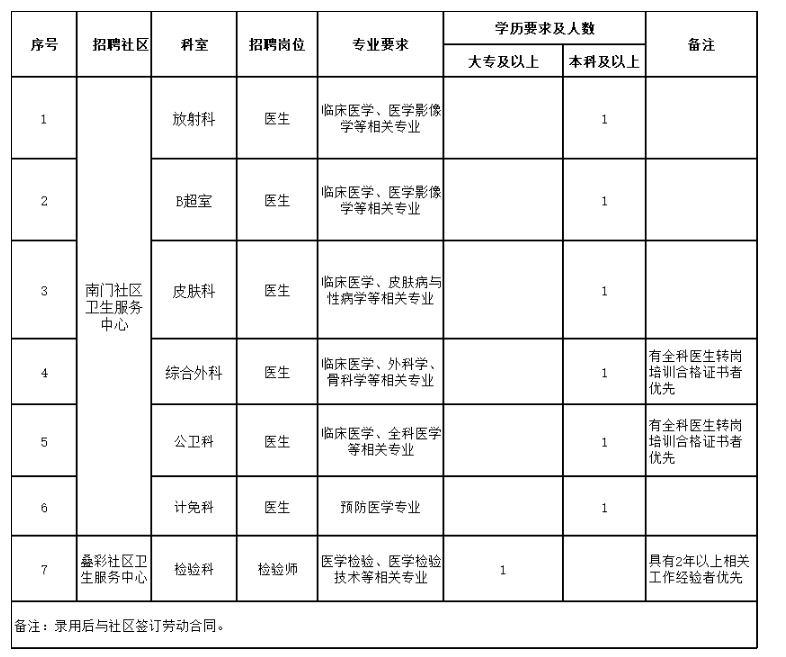 根據(jù)醫(yī)院工作需要,我院南門社區(qū)衛(wèi)生服務(wù)中心、疊彩社區(qū)衛(wèi)生服務(wù)中心擬向社會公開招聘人員7名,現(xiàn)就有關(guān)事項公告如下: