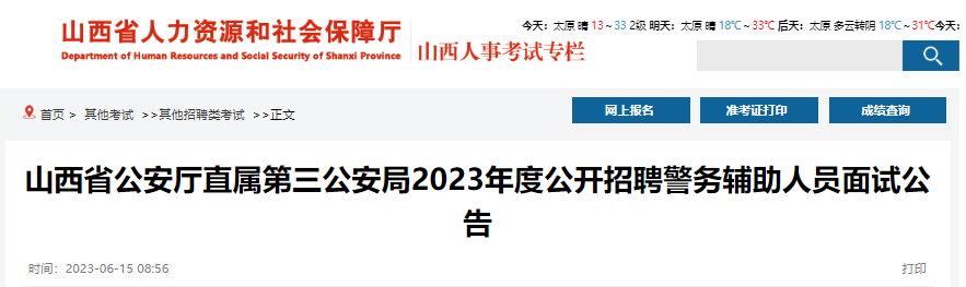 山西省公安廳直屬第三公安局2023年度公開招聘警務(wù)輔助人員面試工作定于2023年6月17日進(jìn)行?,F(xiàn)將有關(guān)事項(xiàng)公告如下: