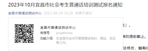 從宜昌市普通話測試中心公眾號獲悉,2023年10月湖北宜昌社會考生普通話考試時(shí)間及報(bào)名時(shí)間已公布,普通話考試時(shí)間10月11日起,報(bào)名時(shí)間9月4日起,具體詳情如下: