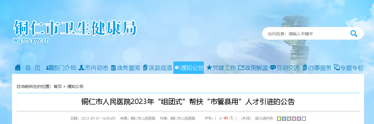 2023貴州銅仁市人民醫(yī)院“組團(tuán)式”幫扶“市管縣用”人才引進(jìn),報(bào)名時(shí)間:2023年9月13日至2023年9月15日(上午9:00--12:00、下午14:00-17:30),現(xiàn)將招聘公告原文發(fā)布如下: