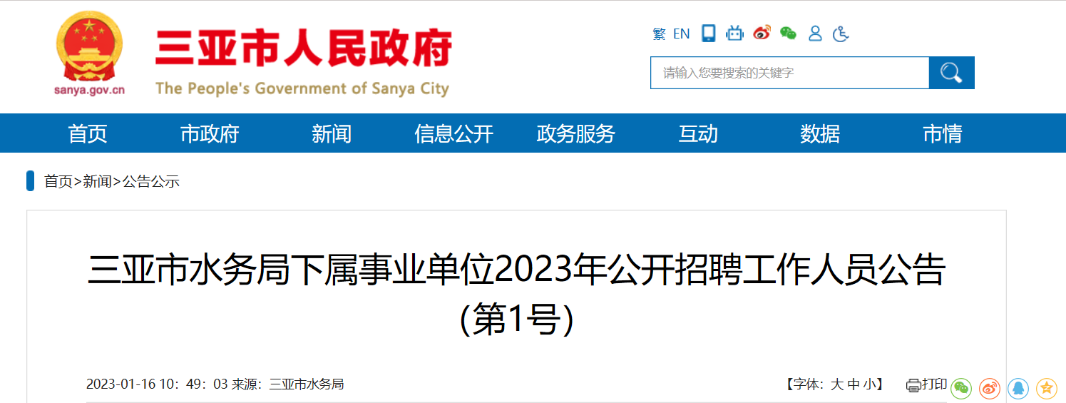 原文標(biāo)題:三亞市水務(wù)局下屬事業(yè)單位2023年公開招聘工作人員公告(第1號)