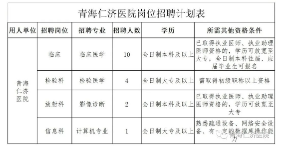(四)青海仁濟(jì)醫(yī)院長(zhǎng)期高薪招聘臨床、醫(yī)技專(zhuān)業(yè)中、高級(jí)職稱(chēng)人員(專(zhuān)業(yè)、人數(shù)不限),具體事宜面議。