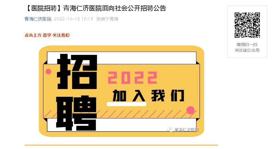 (一)信息公布:本次公開(kāi)招聘有關(guān)告知事項(xiàng)在青海仁濟(jì)醫(yī)院院內(nèi)微信公眾平臺(tái)公布;