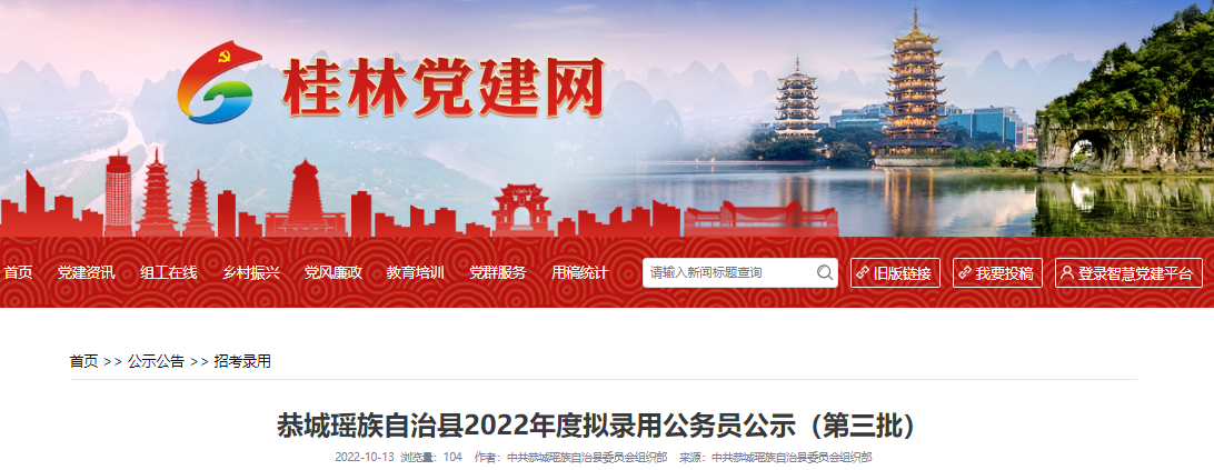 公示期為2022年10月14日至10月20日(共5個(gè)工作日),如對(duì)擬錄用人選有異議,請(qǐng)?jiān)诠酒趦?nèi)向中共恭城瑤族自治縣委員會(huì)組織部實(shí)名反映。