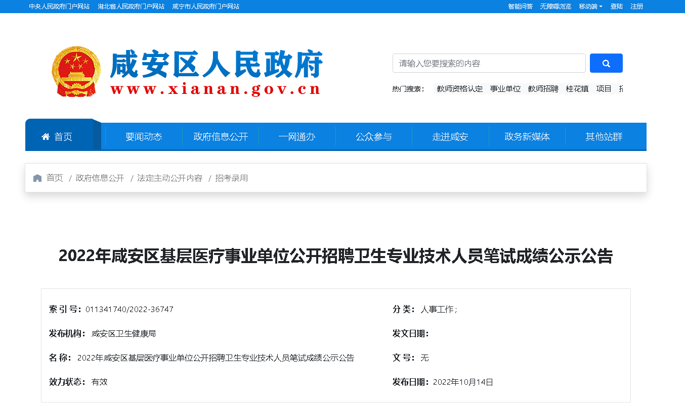 一、2022年咸安區(qū)基層醫(yī)療事業(yè)單位公開招聘衛(wèi)生專業(yè)技術(shù)人員筆試成績公示。