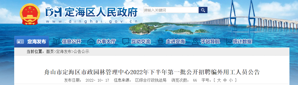 2022下半年浙江省舟山市定海區(qū)市政園林管理中心第一批招聘公告已發(fā)布。報名時間:2022年10月17日至10月26日止;現(xiàn)將招聘公告原文發(fā)布如下: