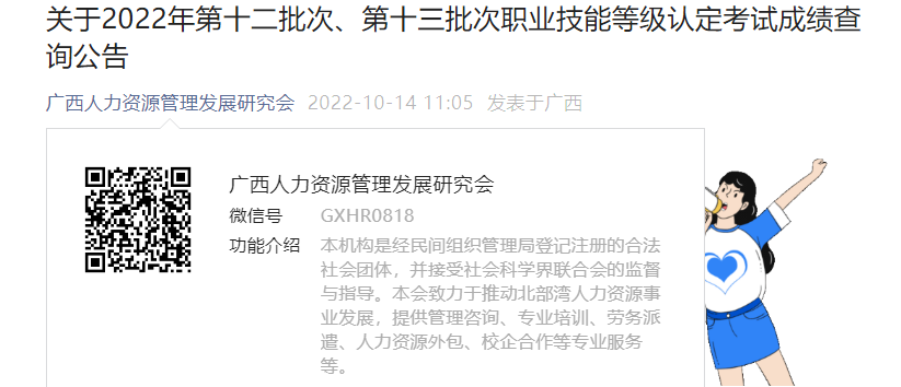 廣西人力資源管理發(fā)展研究會(huì)2022年(9月27日)第十二批次和第十三批次職業(yè)技能等級(jí)認(rèn)定考試成績(jī)即日起公布。現(xiàn)將有關(guān)信息公告如下: