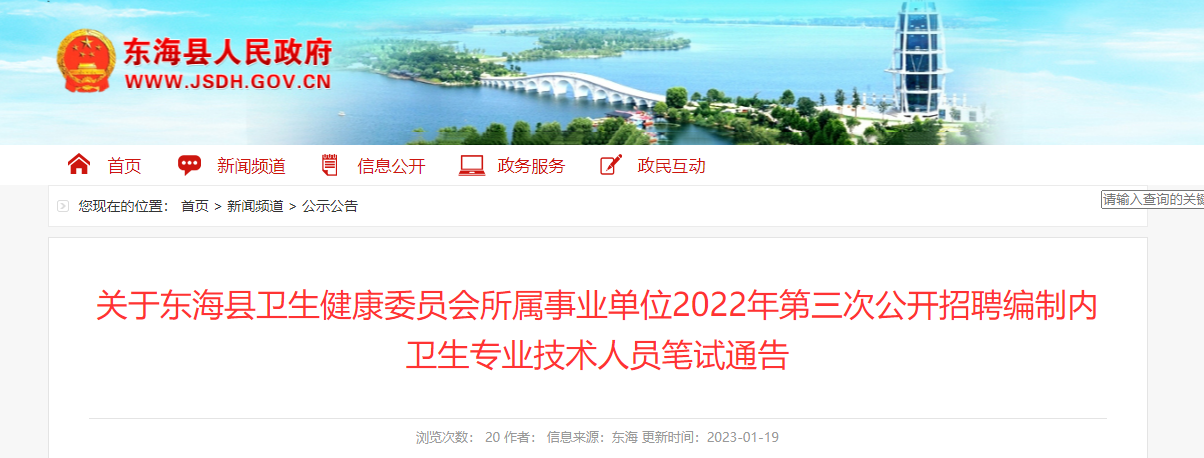 2022江蘇連云港市東海縣衛(wèi)生健康委員會(huì)所屬事業(yè)單位第三次招聘編制內(nèi)衛(wèi)生專業(yè)技術(shù)人員筆試通告已出,筆試考試定于2023年2月4日(星期六)舉行,現(xiàn)將招聘公告原文發(fā)布如下: